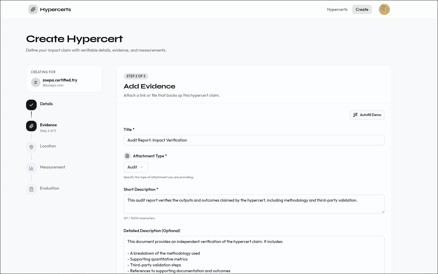Attach supporting documentation that backs up the claim — reports, URLs, files, or other references. Each attachment becomes an org.hypercerts.context.attachment record linked to your hypercert.