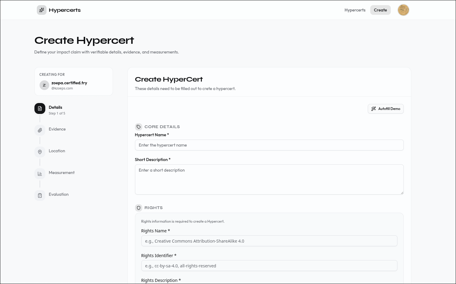 Click "Create a new hypercert" on the home screen (or go directly to hypercerts-scaffold.vercel.app/hypercerts/create). This opens a multi-step wizard. The first step collects the core fields that form the org.hypercerts.claim.activity record on your PDS.