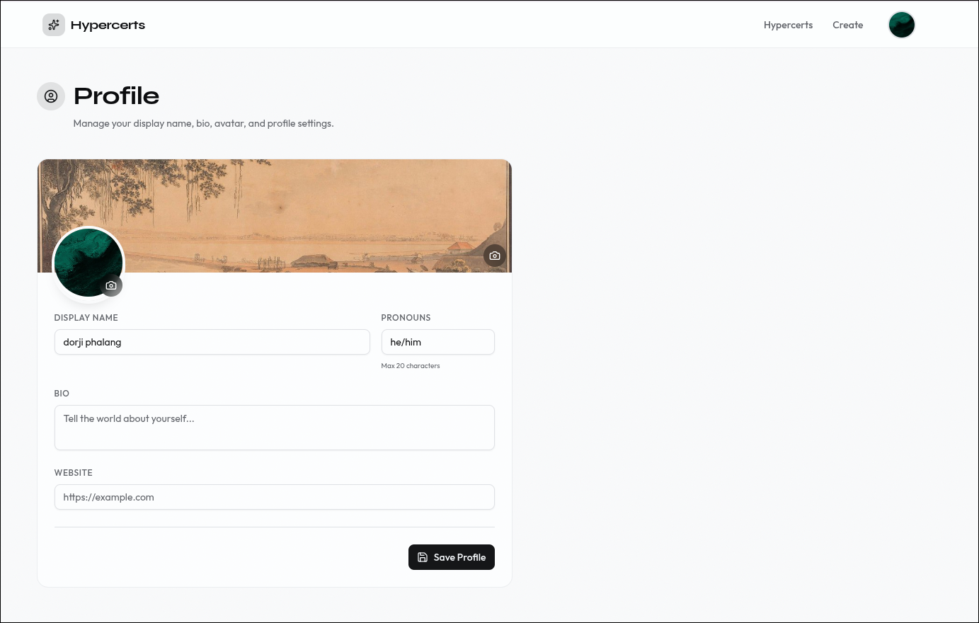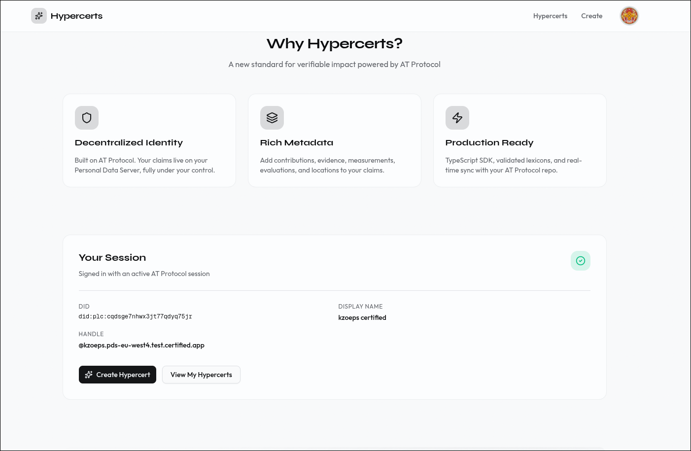 After signing in, the home screen shows your active session — your DID, display name, and handle. From here you can create a new hypercert or view your existing ones.